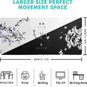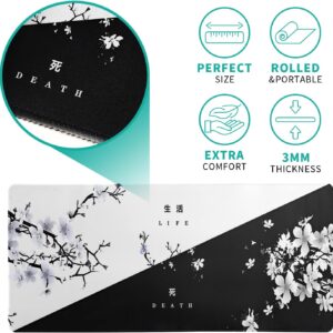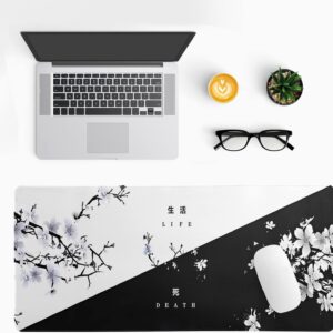 Black and White Japanese Cherry Blossom Gaming Mouse Pad Sakura Death Life Flower Mat 31.5×11.8 Inch Texture Non-Slip Rubber Base Mousepad Stitched Edges Keyboard Desk Pad for Office Home Game