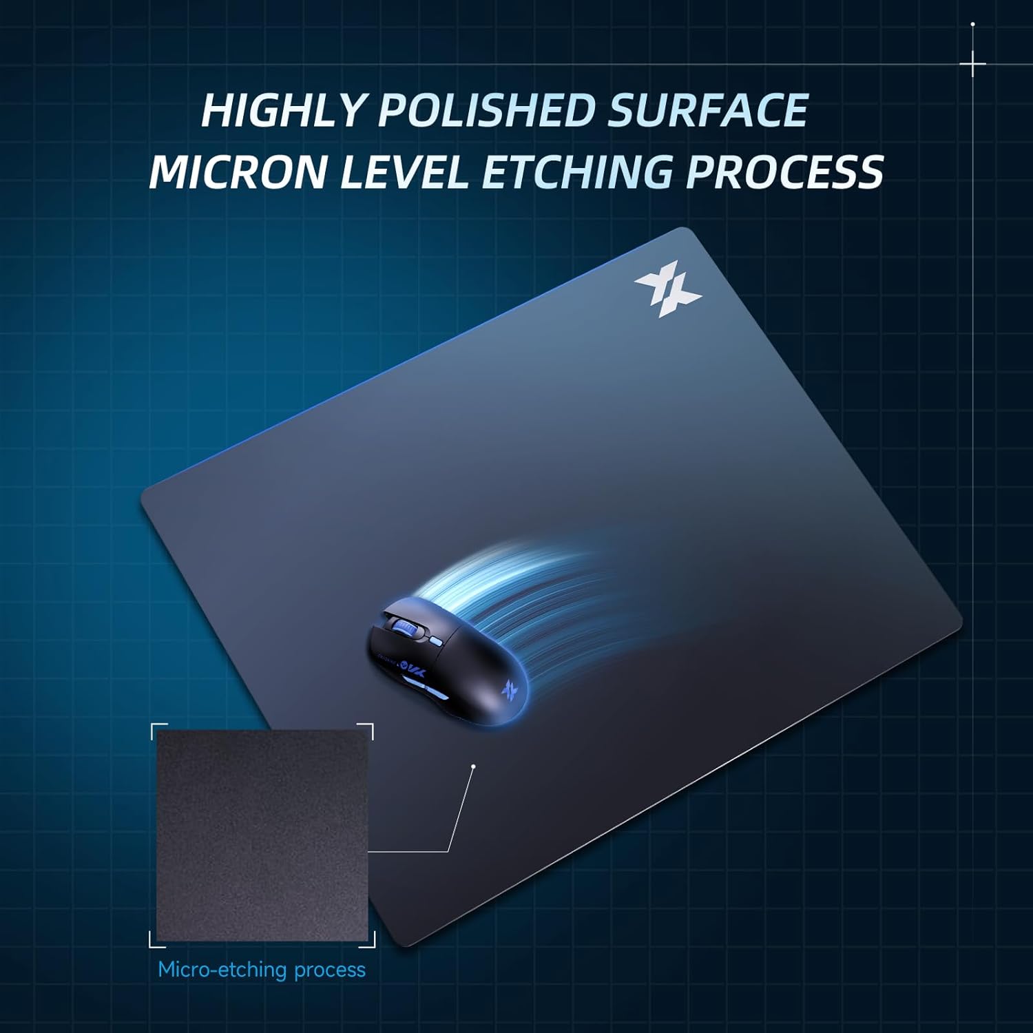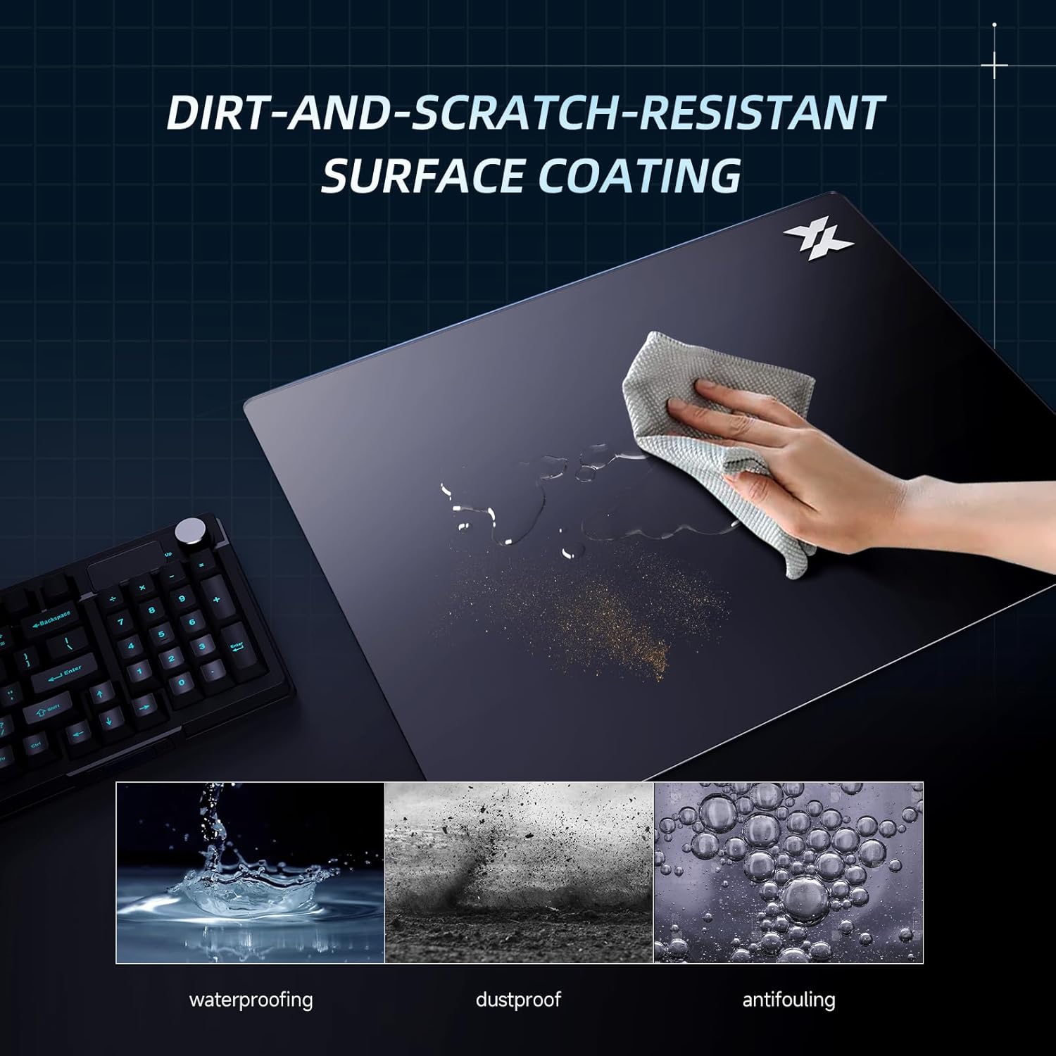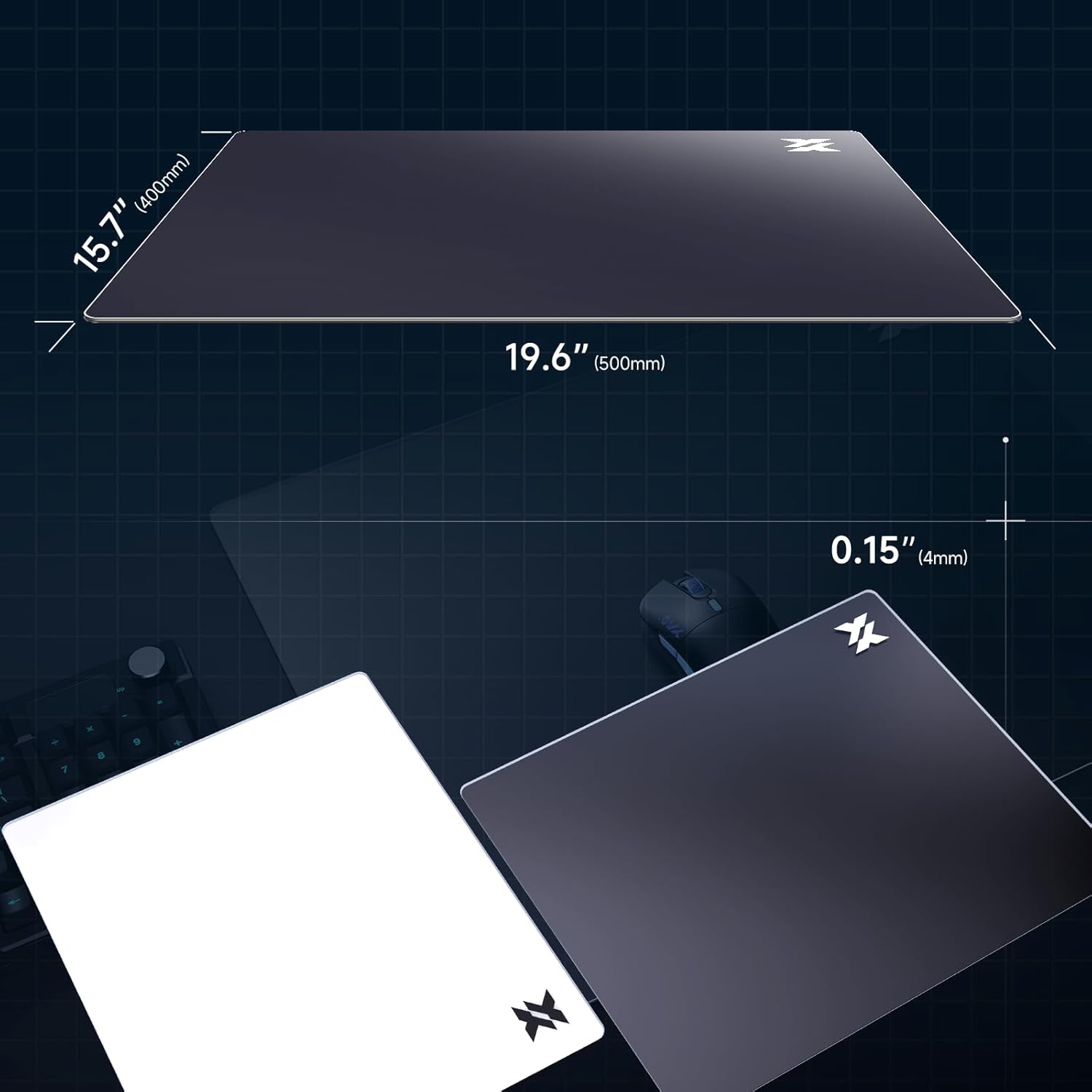 Featuring a polished glass surface with micron-level etching technology, this gaming mouse pad delivers ultra-high tracking precision optimized for competitive esports scenarios. Equipped with a full-coverage non-slip silicone suction base for zero-shift stability during intense gameplay. Seamless CNC-machined edges and a full-size 500x400mm (19.7"x15.7") surface provide battlefield-scale maneuverability, meeting esports players' demands for expansive, precise control.